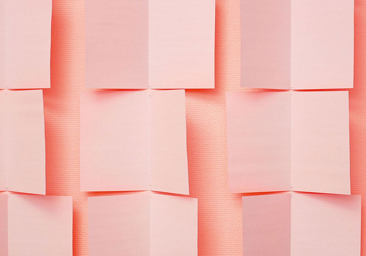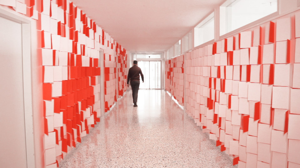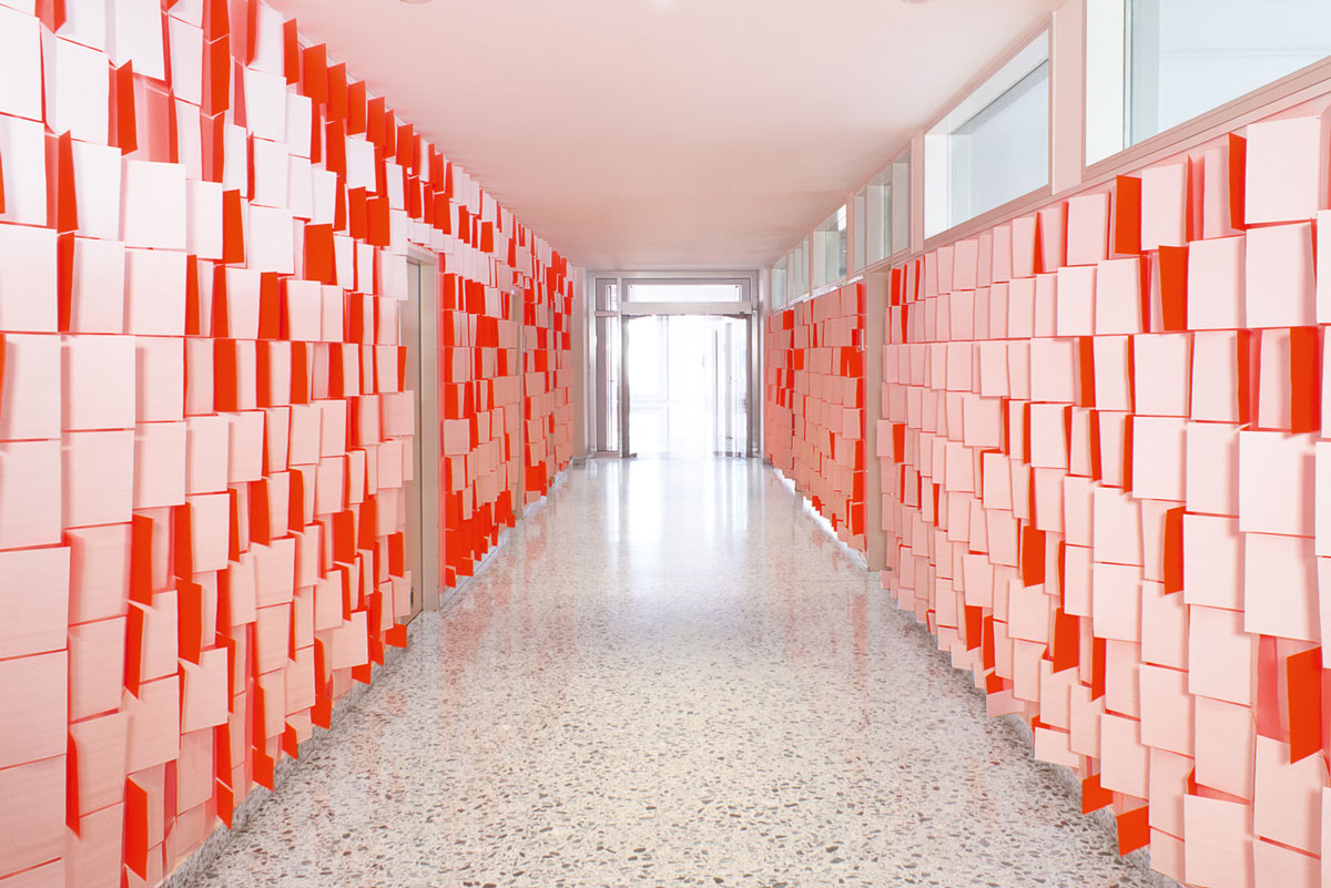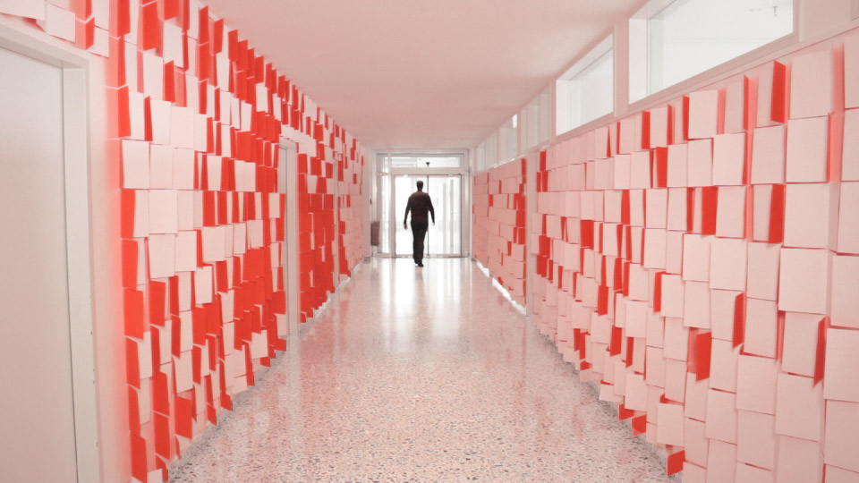 Die gefalteten Blätter werden in vertikalen Reihen so an die Wand gepinnt, dass sie sich leicht bewegen können. Passagen durch den Flur werden von der Bewegung der Papiere an den Wänden begleitet, die entweder die weiße Vorder- oder farbige Rückseite zeigen.
