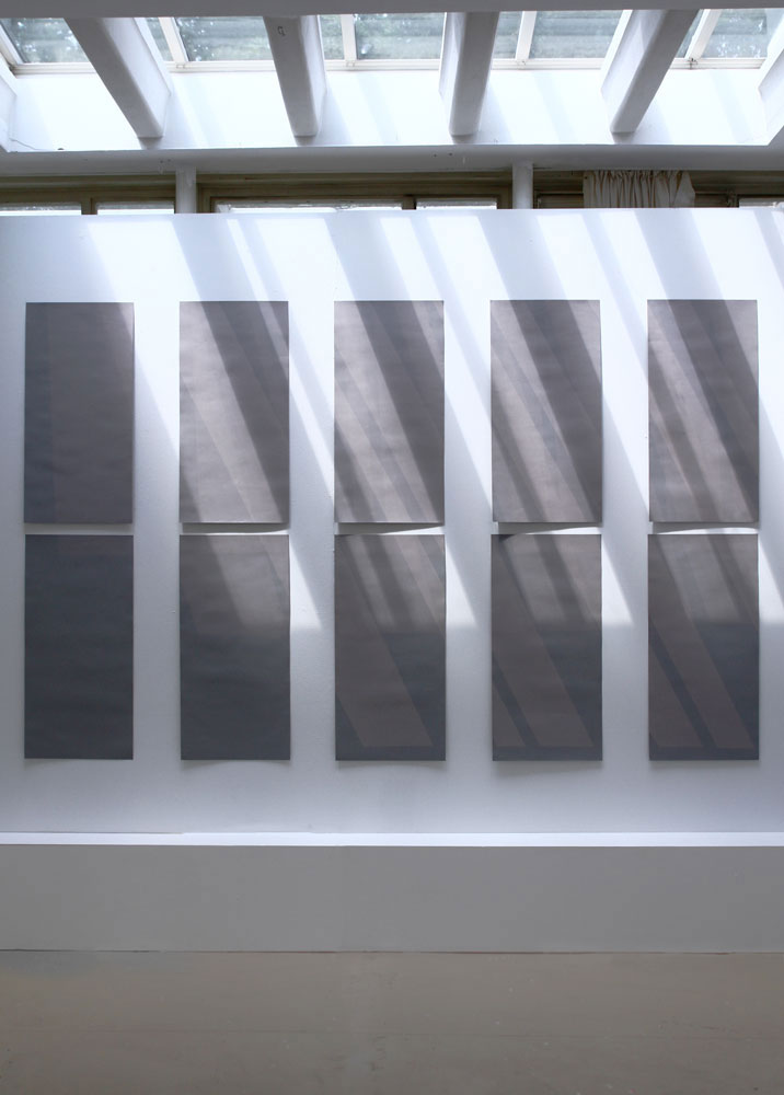 Drei verschiedene Zustände des wandernden Lichteinfalls werden durch Belichtung (mit natürlichem Licht und Schablonen) im Material des grauen Tonkartons festgehalten.