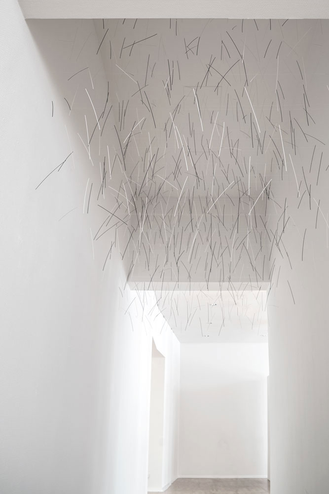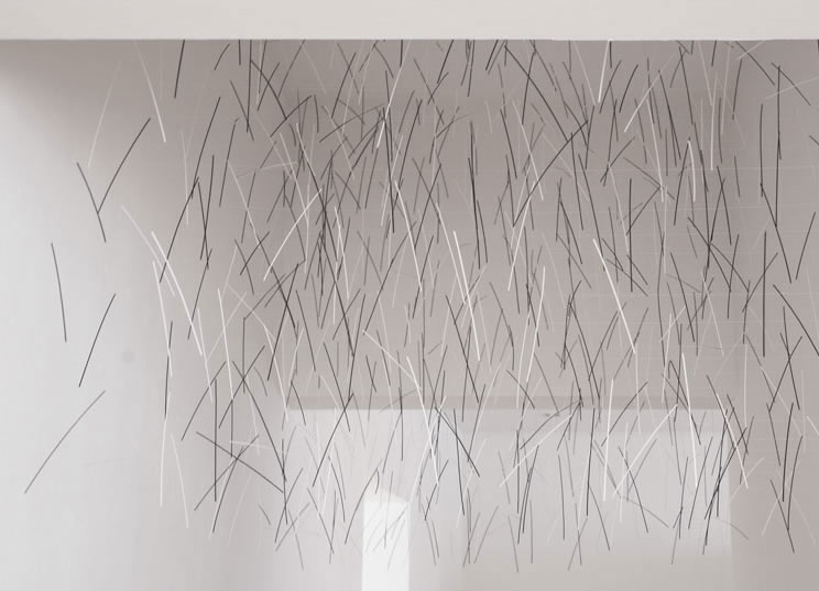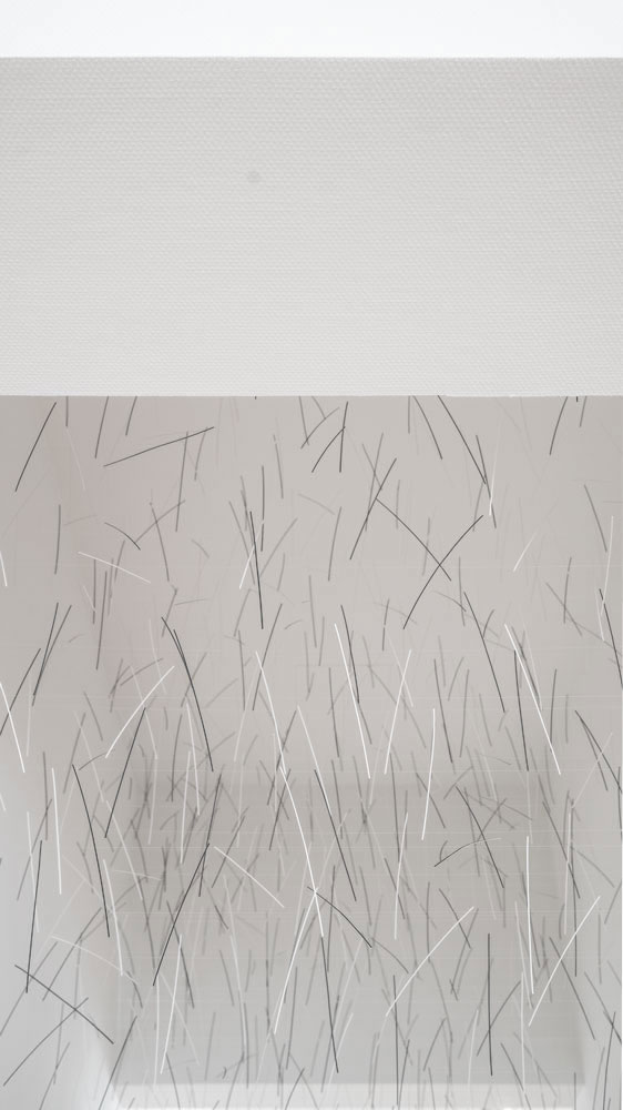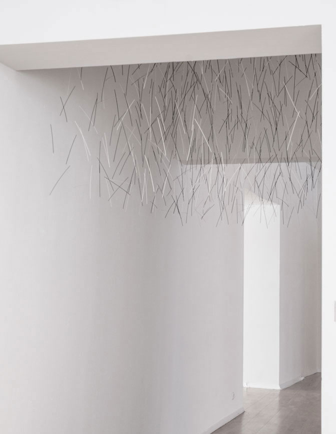 In gleichmäßig getakteten Intervallen aufgefädelte Papierstreifen werden Zeile für Zeile zwischen die zwei Wände gespannt. Mit Bewegung durch die Installation entstehen zeichenartige Überkreuzungen, Schnitte und Brüche. Das Bild verändert sich mit jedem Luftzug, wodurch die Linien zwischen ihrer schwarzen Vorder- und weißen Rückseite wechseln.