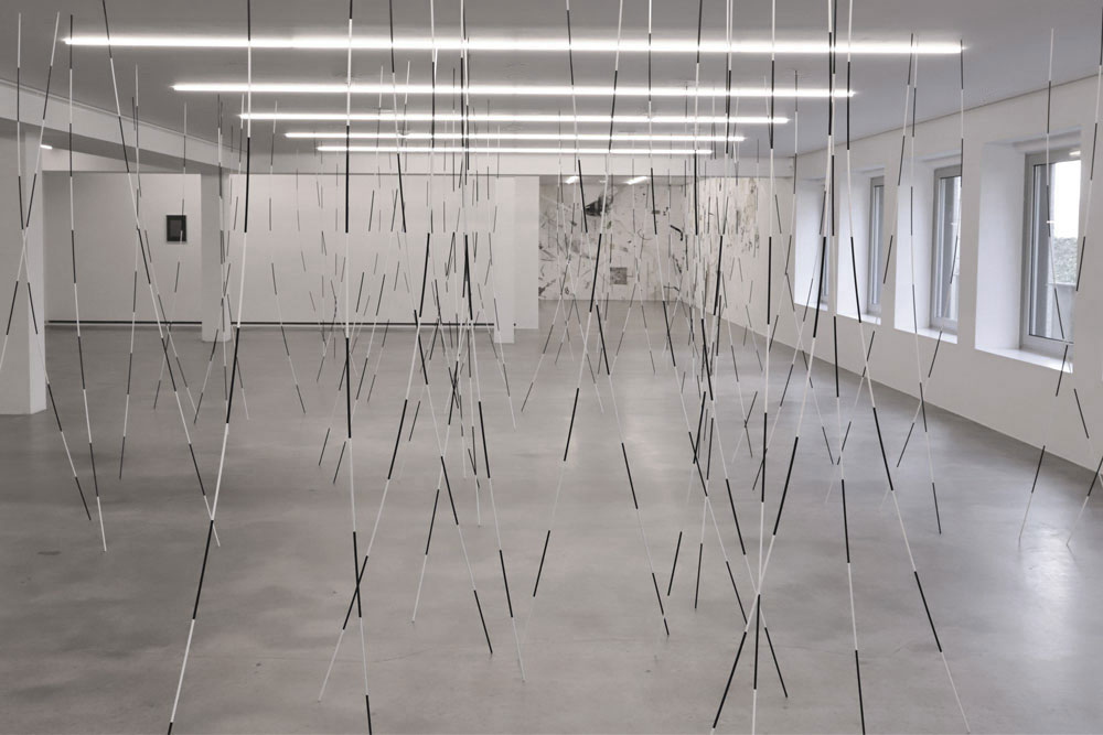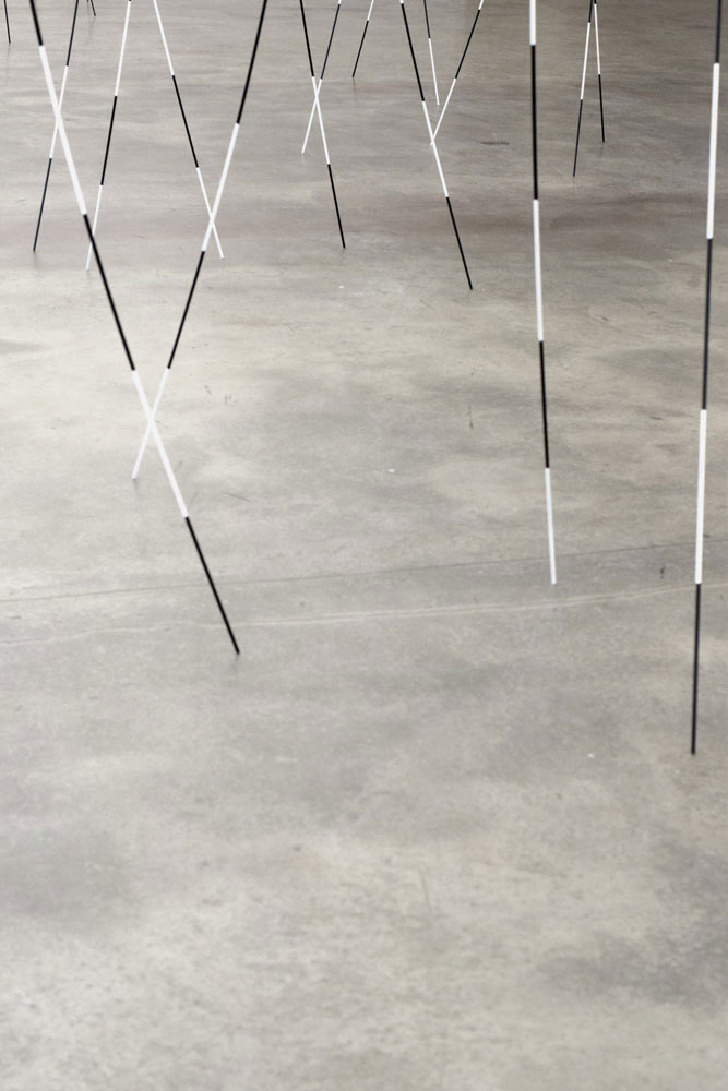 In gleichmäßigen Abschnitten lackierte Aluminiumstäbe werden zwischen Boden und Decke des Ausstellungsraums angeordnet. In einem mikadoartigen Vorgang werden die Stäbe auf dem weiträumigen Feld verteilt, sodass ein Linienwald entsteht, durch welchen der Besucher seine eigenen Pfade windet. Bei wechselnder Perspektive ergeben sich diverse Staffelungen, Kreuzungen und Beziehungen der Linienabschnitte untereinander, sowie mit Raum und Umraum.